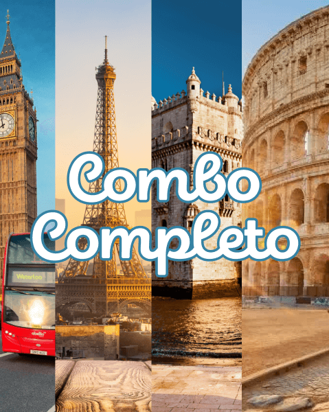 Todos os 15 roteiros incluídos: Paris, Londres, Lisboa, Porto, Roma, Madri, Barcelona, Berlim, Amsterdã, Bruxelas, Nova York, Miami, Orlando, Japão e Buenos Aires